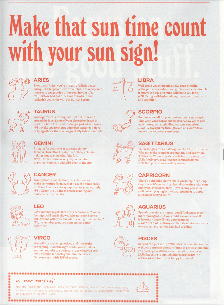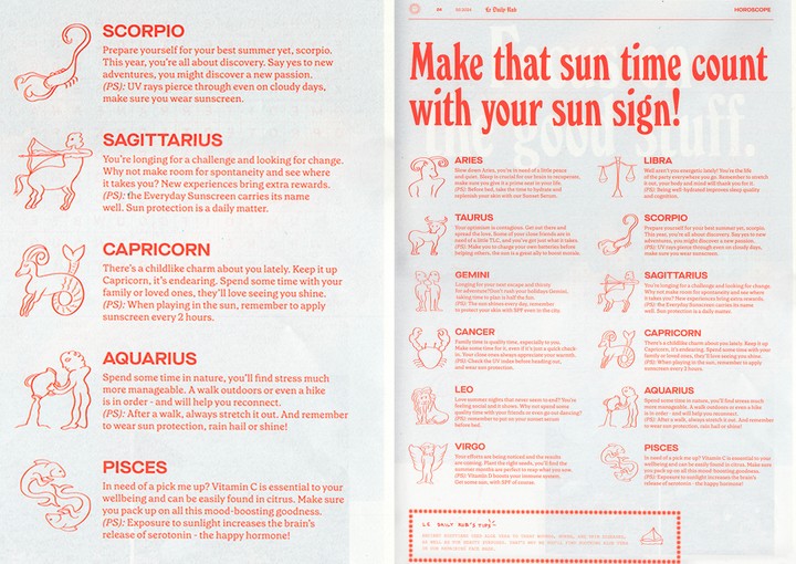 Illustrations made for the suncare Le Rub. Illustrations used in the Astrology section of the printed newspaper.